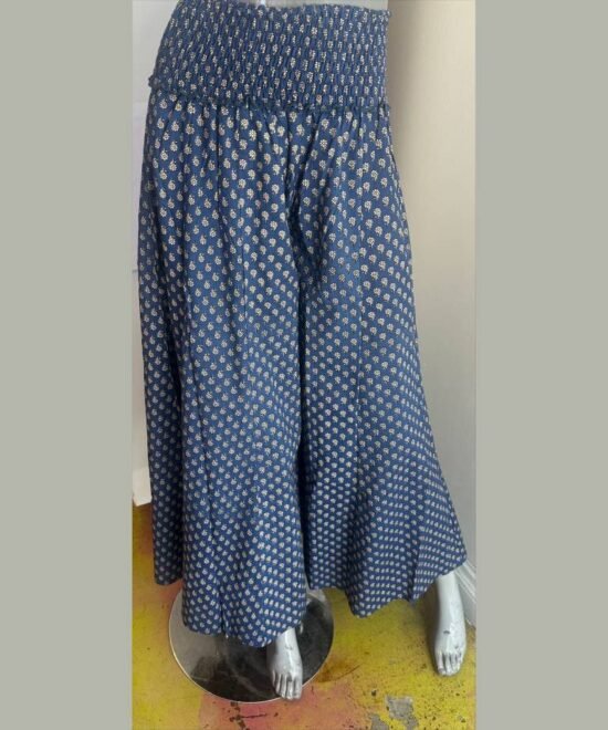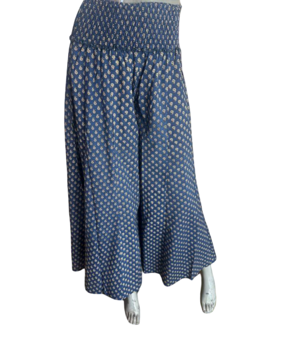 Effortlessly chic and ultra-comfortable, these wide-leg palazzo pants feature a flattering smocked waistband and a flowy silhouette. Designed with a rich navy base and gold mini print, they pair beautifully with any fitted top or cropped blouse.